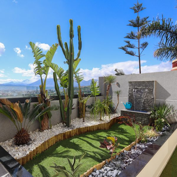 Terrasse avec jardin et fontaine