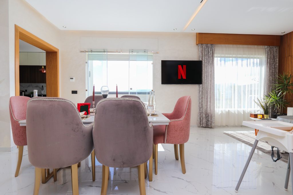 Découvrez un espace repas raffiné où chaque détail a été pensé pour offrir une expérience à la fois chaleureuse et élégante. Parfait pour partager des moments inoubliables en famille ou entre amis, cet espace allie confort moderne et design sophistiqué.